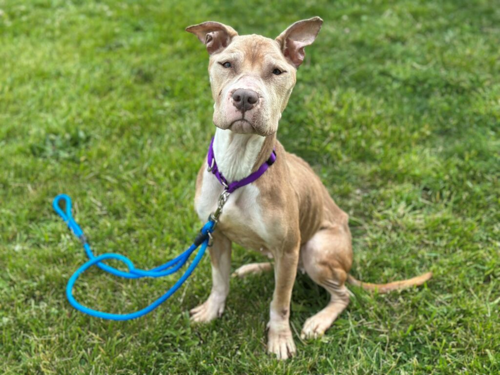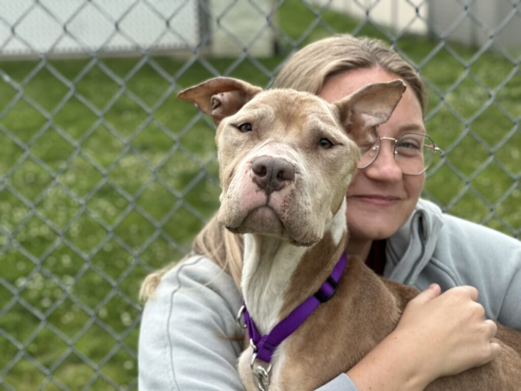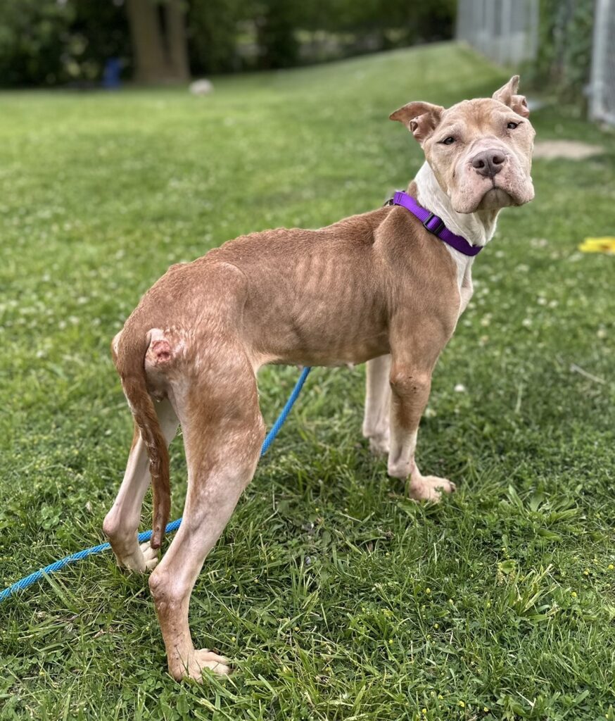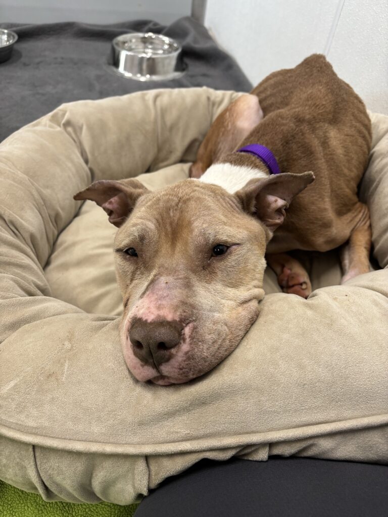 Every year, WHS features a “Hope’s Lights” animal, whose story has really touched their hearts. The 2025, Hope’s Lights animal is DW. DW was brought to us as a stray in heartbreaking condition. Her tail was tucked anxiously, and her prominent ribs, hip bones, and spine showed that she was malnourished, dehydrated, and had been seriously struggling for some time. On top of everything else, DW had multiple pressure sores, exposed scabs, and an infected wound on her hip. After weeks of supportive care, regular veterinary visits, and enrichment time, she gained nearly 20lbs and her once tucked tail was now a wagging testament to her outgoing and joyful personality. DW made a full recovery, and now has a loving family of her own.